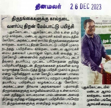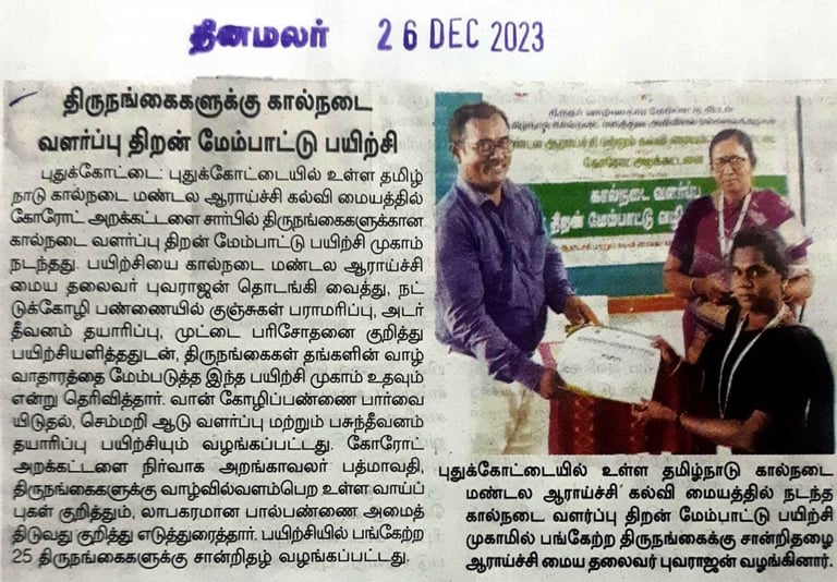 25 transperson from Pudukottai district were provided intensive training on animal husbandry at Tamil Nadu Veterinary and Animal science university, Machuvadi, Pudukottai.