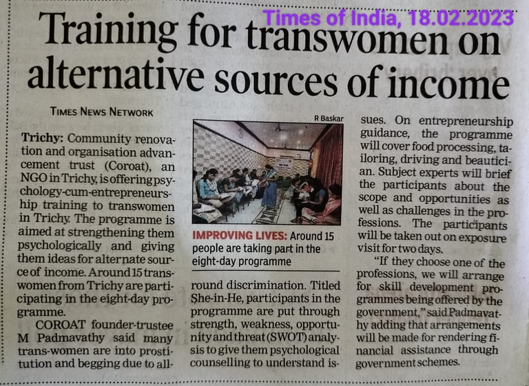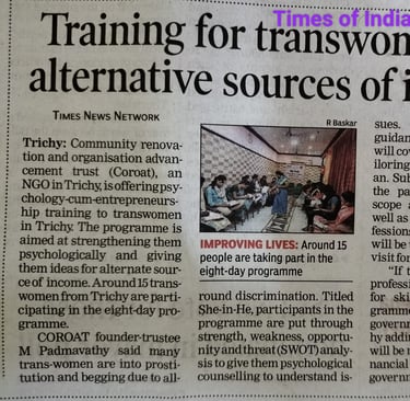 COROAT is implementing "She in He" livelihood promotion project for transperson. COROAT conducts 8 days of training to Transperson to enable them to manage their emotions, improve psychological wellbeing and understand the entrepreneurship opportunties available to them. This is the third batch of training conducted in Trichy.